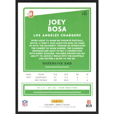 This is a 2020 Donruss Press Proofs Blue Joey Bosa Red D Logo Variation football card. The card is #136 and pictures show condition. Team: Los Angeles Chargers