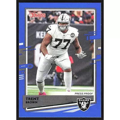 This is a 2020 Donruss Press Proofs Blue Trent Brown football card. The card is #202 and pictures show condition.