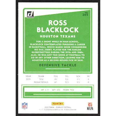 This is a 2020 Donruss Press Proofs Blue Ross Blacklock football card. The card is #283 and pictures show condition. Team: Houston Texans Rookie Card