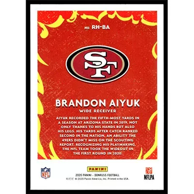 This is a 2020 Donruss Red Hot Rookies Brandon Aiyuk football card. The card is #RH-BA and pictures show condition. Team: San Francisco 49ers Rookie Card