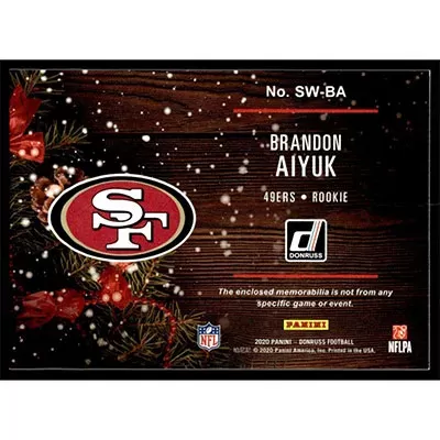This is a 2020 Donruss Rookie Holiday Sweater Brandon Aiyuk Logo Swatch football card. The card is #SW-BA and pictures show condition. Team: San Francisco 49ers Rookie Card