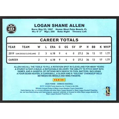 This is a 2020 Donruss Variations Logan Allen Retro baseball card. The card is #243 and pictures show condition. Team(s): Cleveland Indians Rookie Card (RC)
