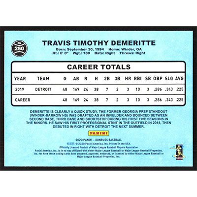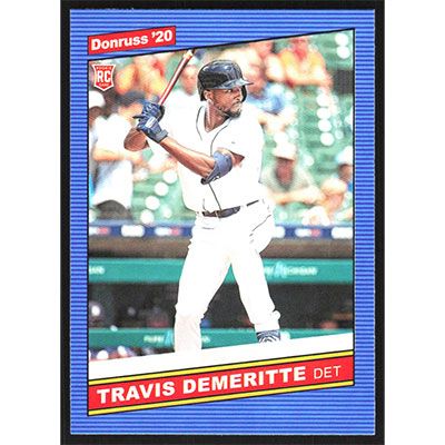 This is a 2020 Donruss Variations Travis Demeritte Retro baseball card. The card is #250 and pictures show condition. Team(s): Detroit Tigers Rookie Card (RC)