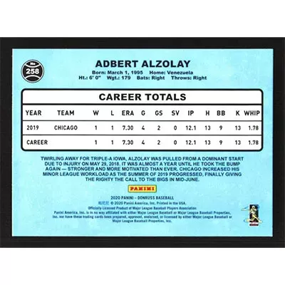 This is a 2020 Donruss Variations Adbert Alzolay Retro baseball card. The card is #258 and pictures show condition. Team(s): Chicago Cubs Rookie Card (RC)