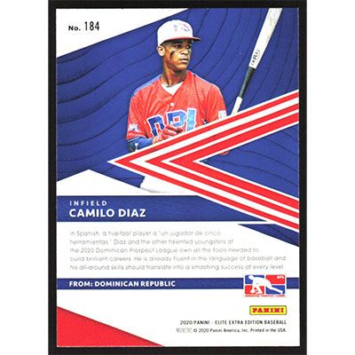 This is a 2020 Elite Extra Edition Pink Camilo Diaz baseball card. The card is #184 and pictures show condition.