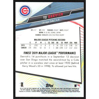 This is a 2020 Finest Yu Darvish baseball card. The card is #52 and pictures show condition.