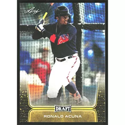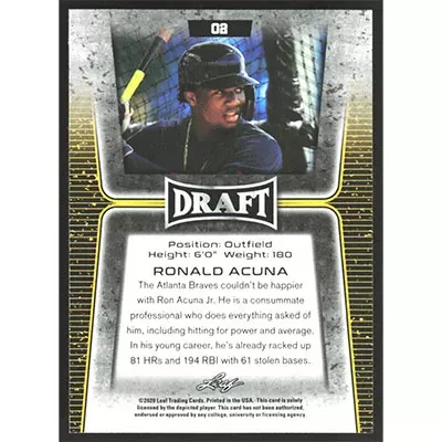 This is a 2020 Leaf Draft Gold Ronald Acuña Jr. baseball card. The card is #08 and pictures show condition.