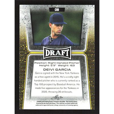 This is a 2020 Leaf Draft Gold Deivi Garcia baseball card. The card is #09 and pictures show condition.