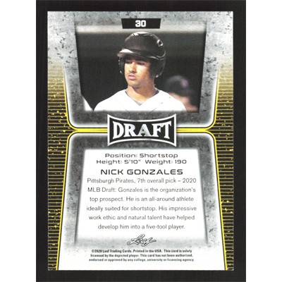 This is a 2020 Leaf Draft Gold Nick Gonzales baseball card. The card is #30 and pictures show condition.