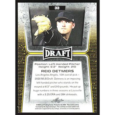 This is a 2020 Leaf Draft Gold Reid Detmers baseball card. The card is #33 and pictures show condition.