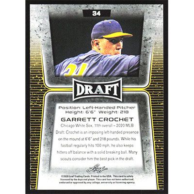 This is a 2020 Leaf Draft Gold Garrett Crochet baseball card. The card is #34 and pictures show condition.