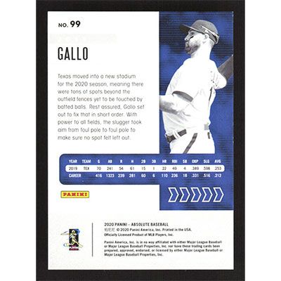 This is a 2020 Panini Absolute Silver Joey Gallo baseball card. The card is #99 and pictures show condition. This card is limited; #'d 181/199. Team(s): Texas Rangers
