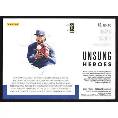 This is a 2020 Panini Absolute Unsung Heroes Ozzie Albies baseball card. The card is #UH10 and pictures show condition.