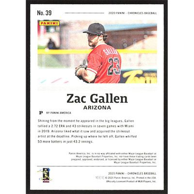 This is a 2020 Panini Chronicles Zac Gallen baseball card. The card is #39 and pictures show condition. Team(s): Arizona Diamondbacks Rookie Card (RC)