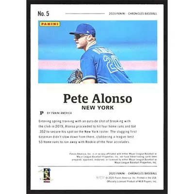 This is a 2020 Panini Chronicles Pete Alonso baseball card. The card is #5 and pictures show condition.