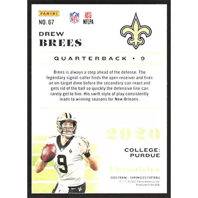 This is a 2020 Panini Chronicles Drew Brees football card. The card is #67 and pictures show condition.