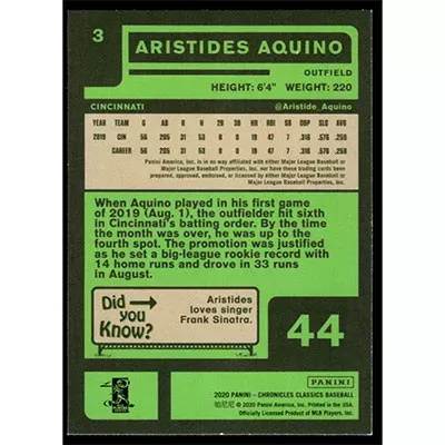 This is a 2020 Panini Chronicles Classics Aristides Aquino baseball card. The card is #3 and pictures show condition. Team(s): Cincinnati Reds Rookie Card (RC)