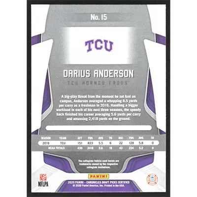 This is a 2020 Panini Chronicles Draft Picks Certified Rookies Darius Anderson football card. The card is #15 and pictures show condition. Team: TCU Horned Frogs Rookie Card