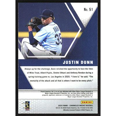 This is a 2020 Panini Chronicles Mosaic Justin Dunn baseball card. The card is #51 and pictures show condition. Team(s): Seattle Mariners Rookie Card (RC)