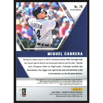 This is a 2020 Panini Chronicles Mosaic Mosaics Miguel Cabrera baseball card. The card is #78 and pictures show condition.