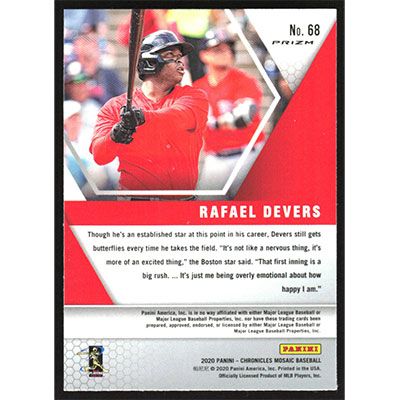 This is a 2020 Panini Chronicles Mosaic Silver Rafael Devers baseball card. The card is #68 and pictures show condition.