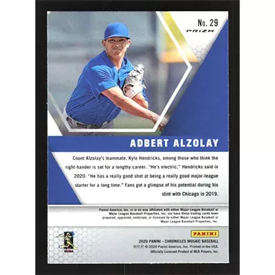 This is a 2020 Panini Chronicles Mosaic Silver Prizms Adbert Alzolay baseball card. The card is #29 and pictures show condition. Team(s): Chicago Cubs Rookie Card (RC)