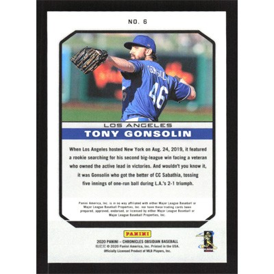 This is a 2020 Panini Chronicles Obsidian Tony Gonsolin baseball card. The card is #6 and pictures show condition. Team(s): Los Angeles Dodgers Rookie Card (RC)