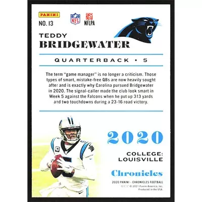 This is a 2020 Panini Chronicles Pink Teddy Bridgewater football card. The card is #13 and pictures show condition.