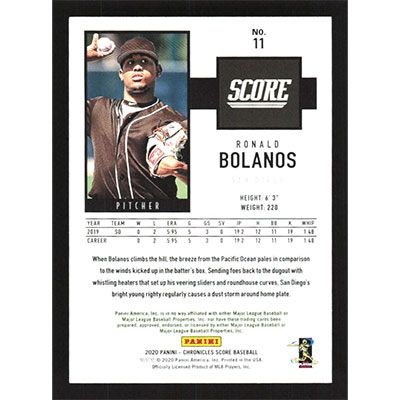 This is a 2020 Panini Chronicles Score Ronald Bolanos baseball card. The card is #11 and pictures show condition. Team(s): San Diego Padres Rookie Card (RC)