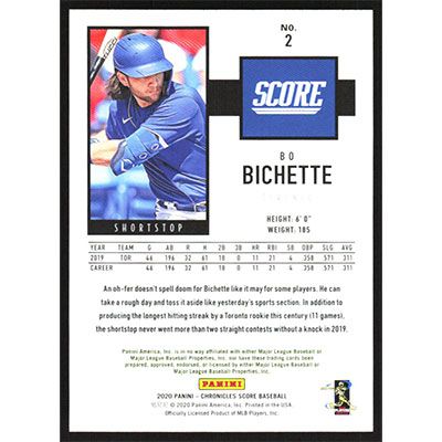 This is a 2020 Panini Chronicles Score Bo Bichette baseball card. The card is #2 and pictures show condition. Team(s): Toronto Blue Jays Rookie Card (RC)