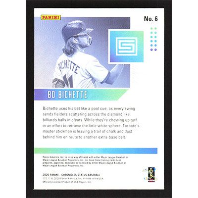 This is a 2020 Panini Chronicles Status Green Bo Bichette baseball card. The card is #6 and pictures show condition. Team(s): Toronto Blue Jays Rookie Card (RC)