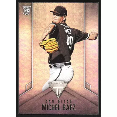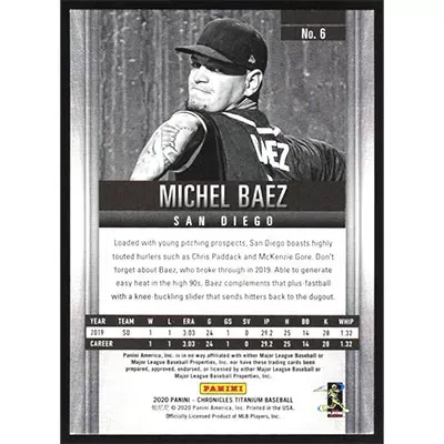 This is a 2020 Panini Chronicles Titanium Michel Baez baseball card. The card is #6 and pictures show condition. Team(s): San Diego Padres Rookie Card (RC)