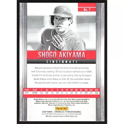 This is a 2020 Panini Chronicles Titanium Shogo Akiyama baseball card. The card is #7 and pictures show condition. Team(s): Cincinnati Reds Rookie Card (RC)