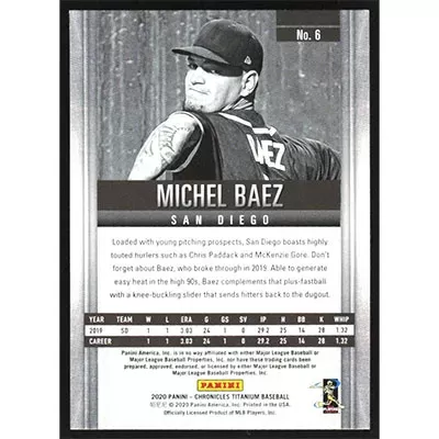 This is a 2020 Panini Chronicles Titanium Green Michel Baez baseball card. The card is #6 and pictures show condition. Team(s): San Diego Padres Rookie Card (RC)