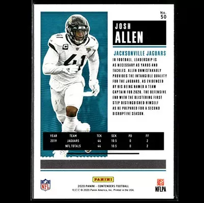 This is a 2020 Panini Contenders Josh Allen football card. The card is #50 and is in NM-MT condition.
