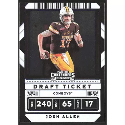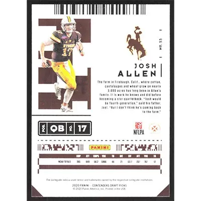 This is a 2020 Panini Contenders Draft Picks Draft Ticket Blue Foil Josh Allen football card. The card is #53 and pictures show condition. Team: Wyoming Cowboys