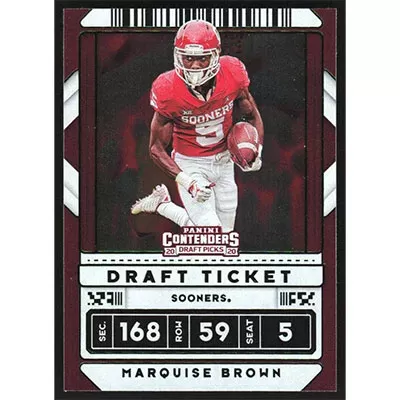 This is a 2020 Panini Contenders Draft Picks Draft Ticket Green Foil Marquise Brown football card. The card is #66 and pictures show condition. Team(s): Oklahoma Sooners
