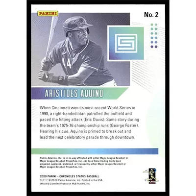 This is a 2020 Panini Contenders Status Aristides Aquino baseball card. The card is #2 and pictures show condition. Team(s): Cincinnati Reds Rookie Card (RC)