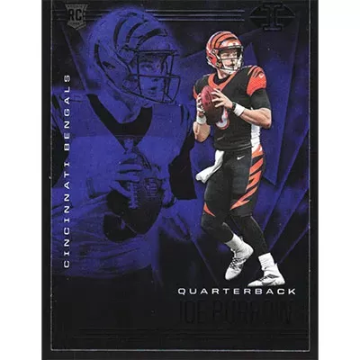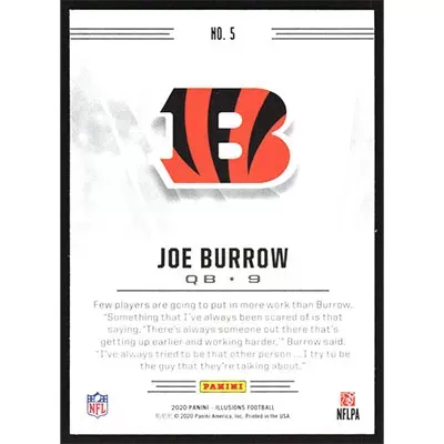 This is a 2020 Panini Illusions Sapphire Joe Burrow football card. The card is #5 and pictures show condition. Team(s): Cincinnati Bengals Rookie Card (RC)