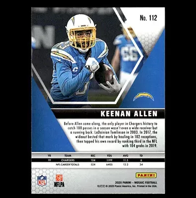This is a 2020 Panini Mosaic Keenan Allen football card. The card is #112 and is in NM-MT condition.