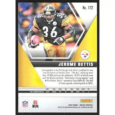This is a 2020 Panini Mosaic Jerome Bettis football card. The card is #172 and pictures show condition.
