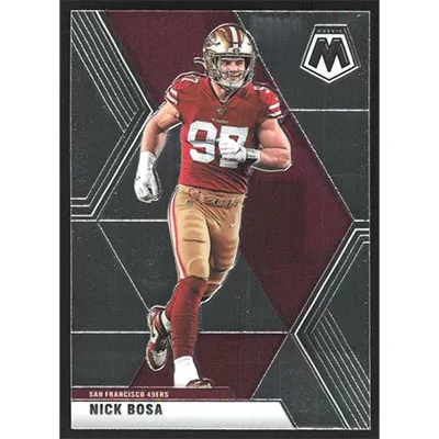 This is a 2020 Panini Mosaic Nick Bosa football card. The card is #180 and pictures show condition.