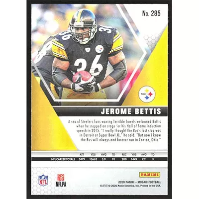 This is a 2020 Panini Mosaic Jerome Bettis Hall of Fame football card. The card is #285 and pictures show condition.