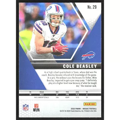 This is a 2020 Panini Mosaic Cole Beasley football card. The card is #29 and pictures show condition.