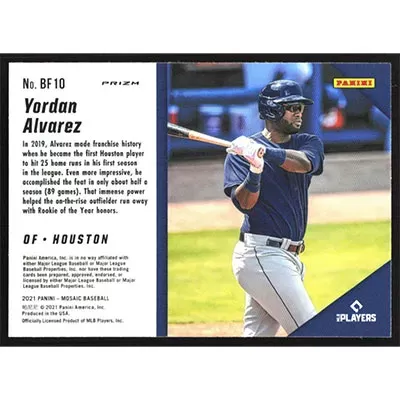This is a 2020 Panini Mosaic Big Fly Green Yordan Alvarez baseball card. The card is #BF10 and pictures show condition.