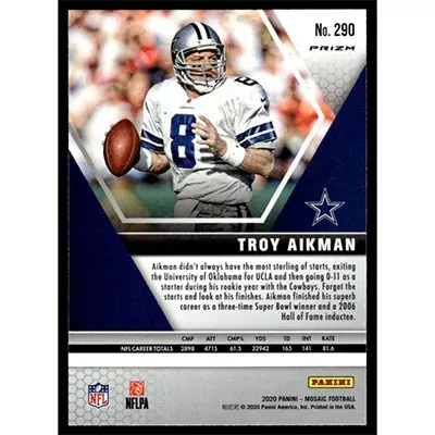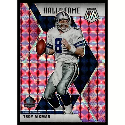 This is a 2020 Panini Mosaic Camo Pink Prizm Troy Aikman Hall of Fame football card. The card is #290 and pictures show condition. Team: Dallas Cowboys