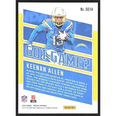 This is a 2020 Panini Mosaic Got Game? Keenan Allen football card. The card is #GG14 and pictures show condition.
