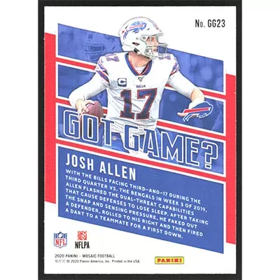 This is a 2020 Panini Mosaic Got Game? Josh Allen football card. The card is #GG23 and pictures show condition.