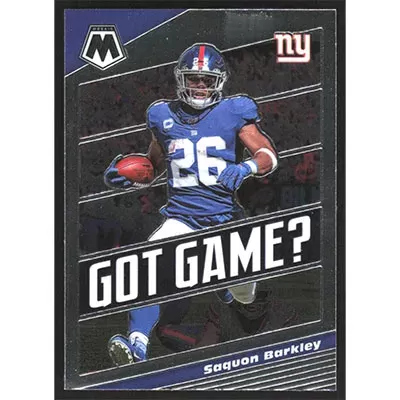 This is a 2020 Panini Mosaic Got Game? Saquon Barkley football card. The card is #GG9 and pictures show condition.