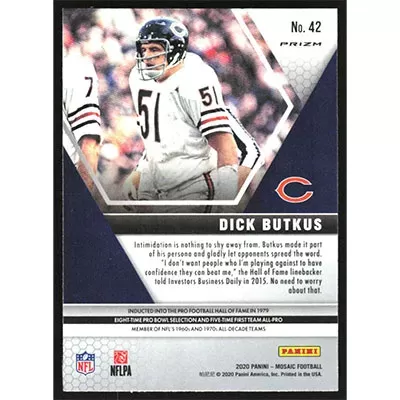 This is a 2020 Panini Mosaic Green Dick Butkus football card. The card is #42 and pictures show condition.